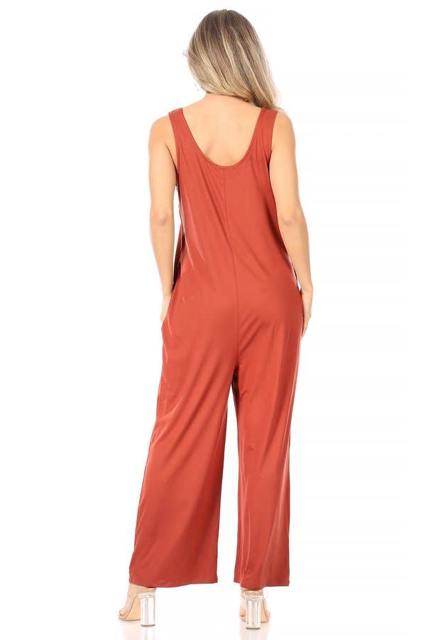 Solid sleeveless full length jumpsuit with a round neckline and side pockets.