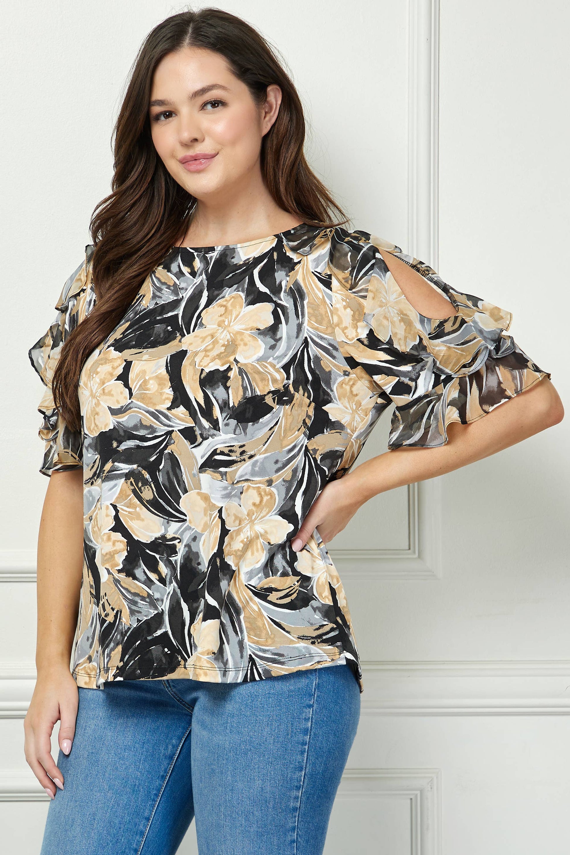The BREEZY BLISS BOATNECK TOP WITH FLIRTY RUFFLE SLEEVES is a must-have addition to any retailer's collection. This effortlessly chic plus-size top features a flattering boatneck design, offering a comfortable yet stylish neckline perfect for warm-weather wear. The cold-shoulder detailing adds a trendy touch, while the flirty ruffle sleeves provide feminine movement and playful charm. Crafted from soft, breathable fabric, this top is perfect for layering or wearing alone, making it a versatile piece for any wardrobe. Available in a range of sizes, it's an ideal choice for your customers seeking both comfort and style. A versatile, easy-to-wear option, the Breezy Bliss Boatneck Top is perfect for casual outings, day-to-day wear, or even dressier occasions when paired with the right accessories.