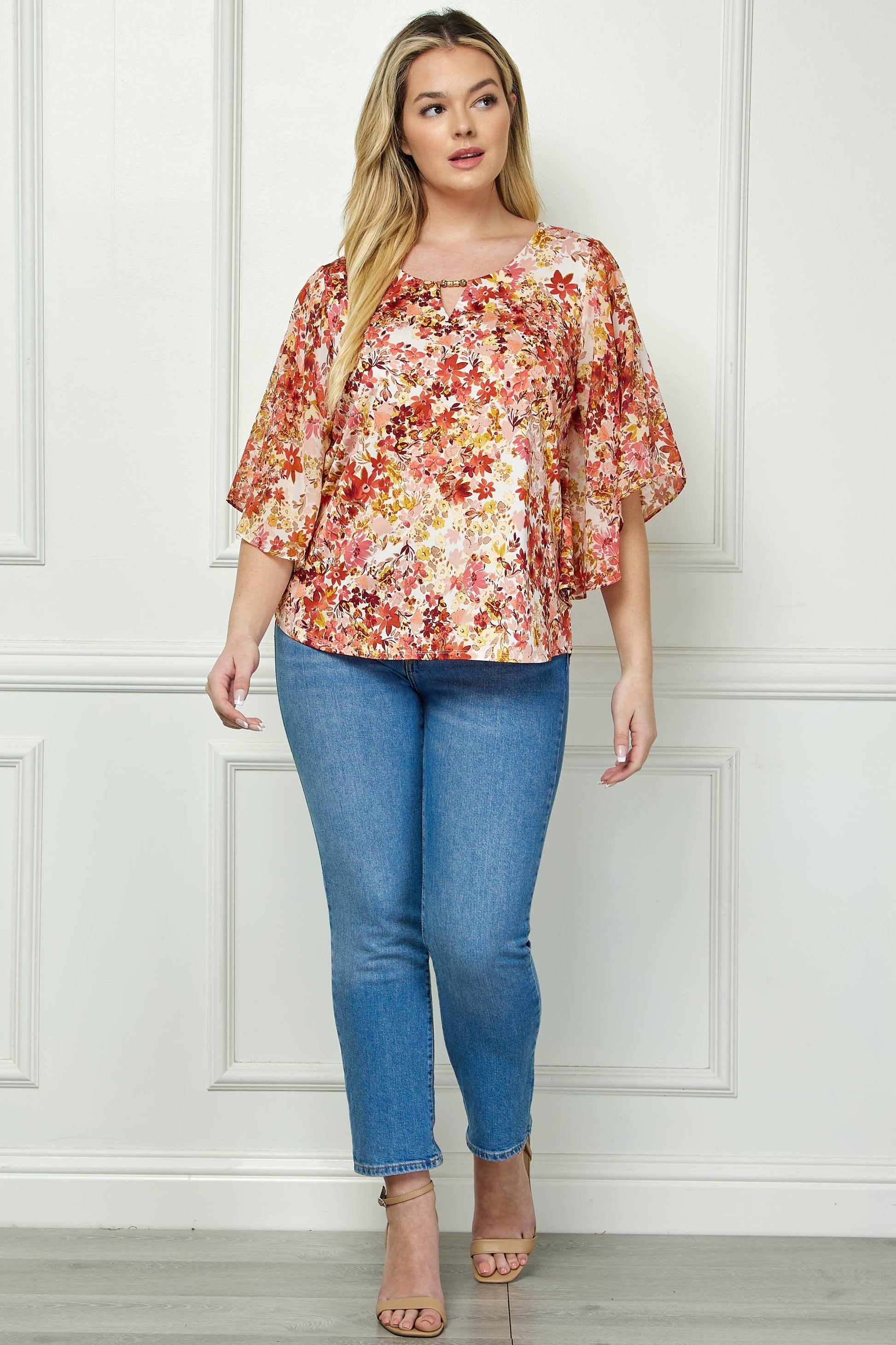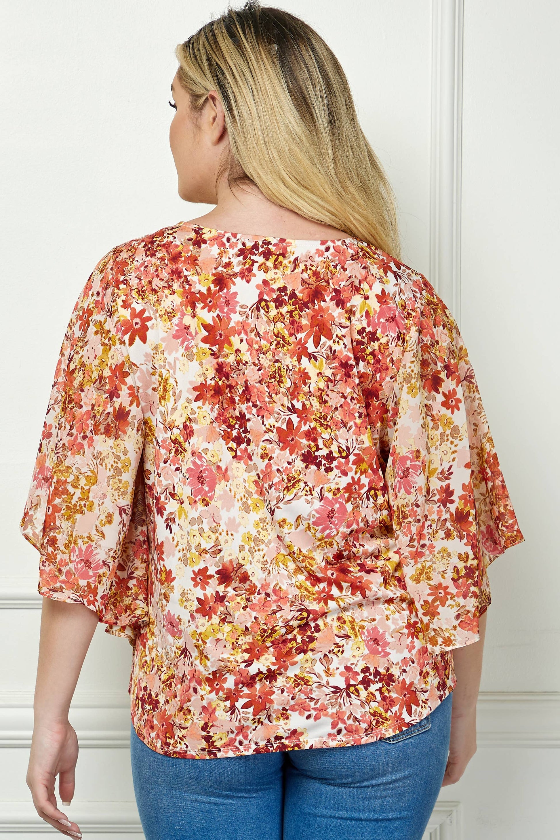 PLUS SIZE FLORAL PRINTED 3/4 BAT WING SLEEVE BLOUSE