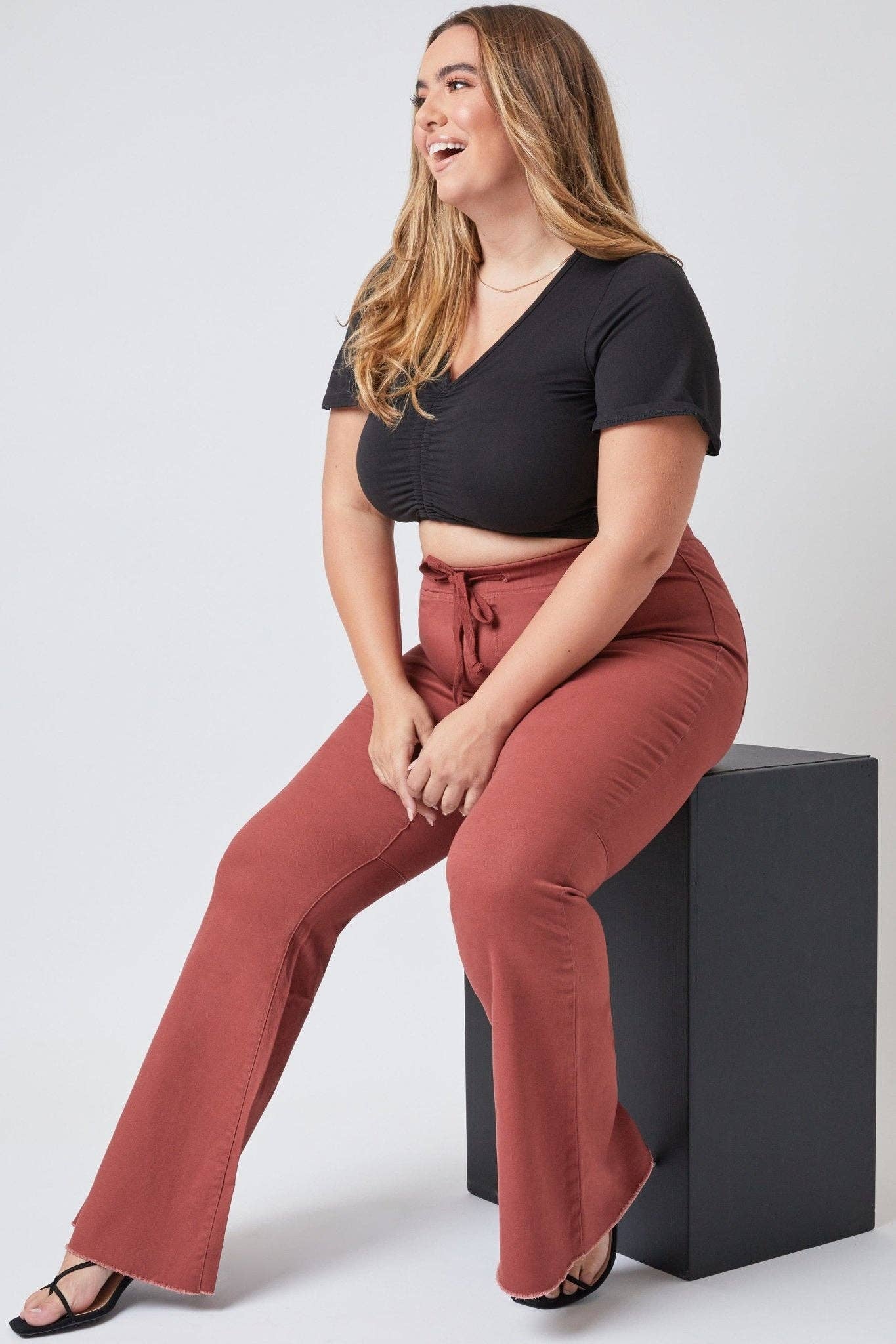 Featuring a high-rise, drawstring waist, double back pocket construction, a super trendy flared fit with a raw hem. These jogger inspired jeans will be great to add to your wardrobe.